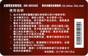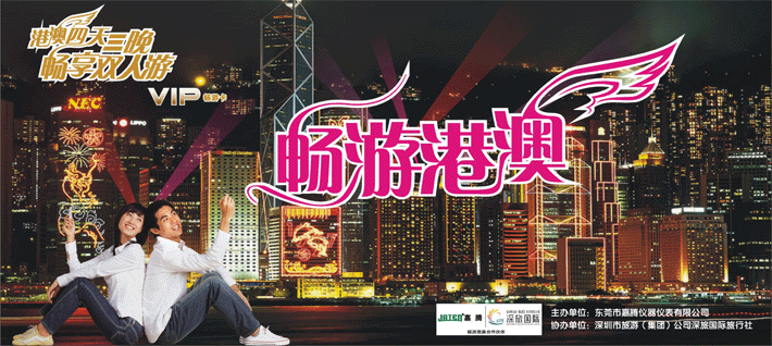 為答謝您一直以來對我嘉騰公司的關(guān)懷與厚愛,東莞市嘉騰儀器儀表有限公司與深圳市旅游(集團)公司深旅國際旅行社攜手推出“購嘉騰儀器,港澳雙人游”活動:自2010年10月1日起(有效期限2011年12月31日止),凡購買嘉騰公司指定產(chǎn)品(高端儀器或大型儀器)一臺以上,均可獲得我公司饋贈的“港澳四天三晚雙人游--VIP暢游卡”一份!多買多送,送完即止!