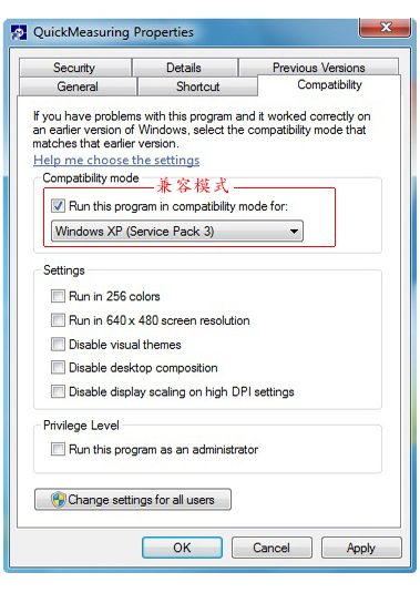 電腦桌面QuickMeasuring測(cè)量軟件快捷方式圖標(biāo)右鍵->屬性(打開QuickMeasuring屬性)->選擇“兼容性”標(biāo)簽,勾選“以兼容模式運(yùn)行這個(gè)程序”,然后在下拉菜單里選擇一個(gè)兼容模式,完成后確定退出。