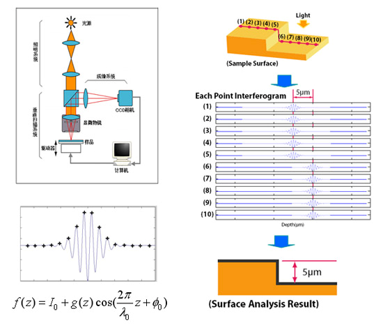 白光干涉三維形貌儀是利用光學(xué)干涉原理研制開發(fā)的超精密表面輪廓測(cè)量?jī)x器。照明光束經(jīng)半反半透分光鏡分成兩束光,分別投射到樣品表面和參考鏡表面。從兩個(gè)表面反射的兩束光再次通過(guò)分光鏡后合成一束光,并由成像系統(tǒng)在CCD相機(jī)感光面形成兩個(gè)疊加的像。由于兩束光相互干涉,在CCD相機(jī)感光面會(huì)觀察到明暗相間的干涉條紋。干涉條紋的亮度取決于兩束光的光程差,根據(jù)白光干涉條紋明暗度以及干涉條文出現(xiàn)的位置解析出被測(cè)樣品的相對(duì)高度。